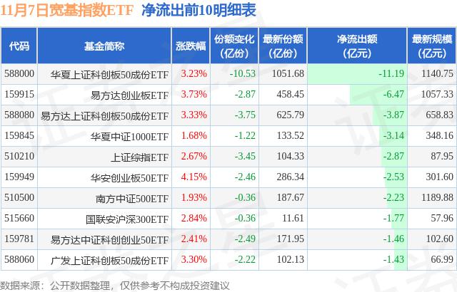 当天有 115 只宽基指数 ETF 资金净流出出现在基金中,其中华夏上证科技创新板排名第一。 50 成分 ETF(588000),份额下降 10.53 一亿份,净流出额为 11.19 亿元。