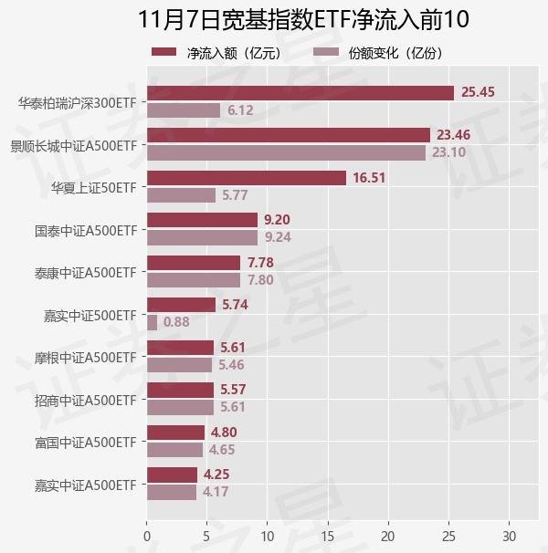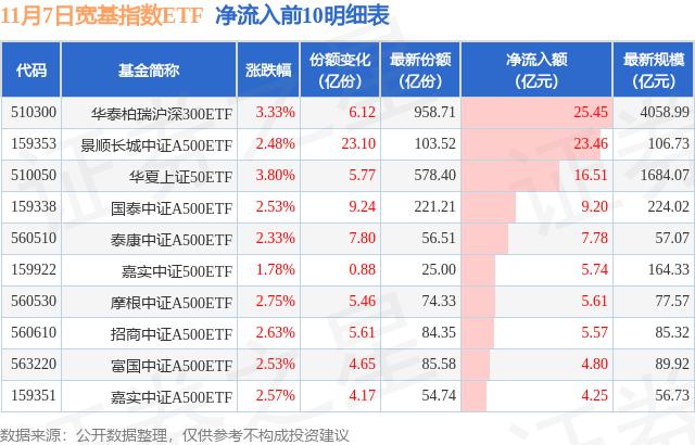 当天有 43 只宽基指数 ETF 资金净流入为基金,其中华泰柏瑞沪深圳净流入排名第一。 增加了300ETF(510300)的份额 6.12 十亿份,净流入额为 25.45 亿元。