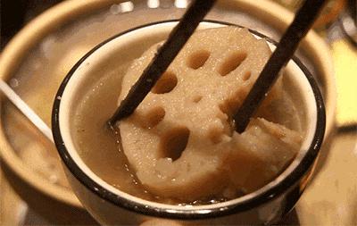 白汤里有淡淡的绯红,煮熟的莲藕,性子由凉变暖,祛燥清火。咬下去沙沙作响,还连着丝。