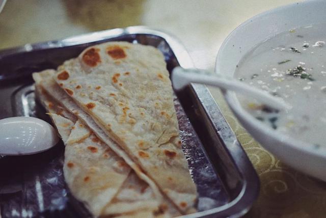勺子在汤里转来转去,白汤底像牛奶一样。此时配上一个烧饼,然后掰成小块,泡在汤里,烧饼就是羊汤的味道。