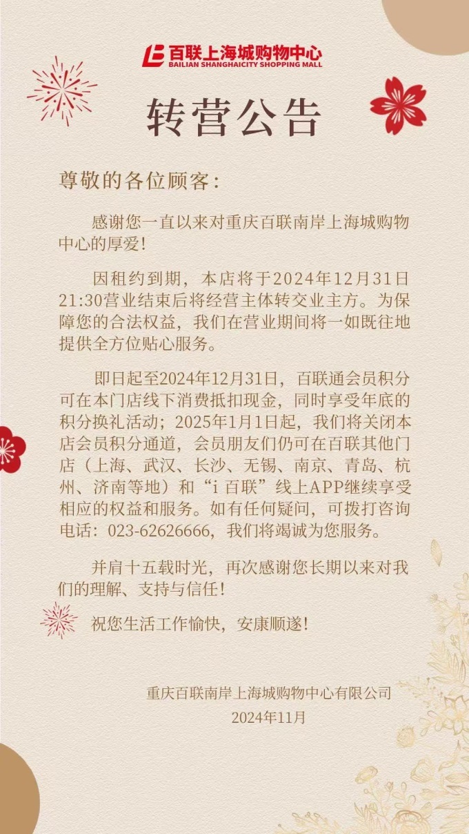 在转营公告中,重庆百联上海城购物中心表示,由于租约期满,百联上海城购物中心将于2024年12月31日21日:30经营结束后,将经营主体转移给业主。
