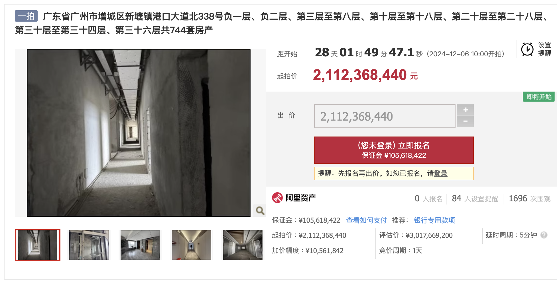十一月八日,根据阿里法拍网披露的信息,广东省广州市增城区新塘镇港口大道北338号负一层、负二层、三至八层、十至十八层、二十至二十八层、三十四至三十四层、三十六层共有744套房产,起拍价约21.12亿元,起拍价1.37万元/平方米。本次拍卖涉及商业、酒店及办公用途,将于12月6日10时开始竟价,竟价周期为1天。而且以上标的物就是凯达尔枢纽国际广场的房地产,持有者是广州凯达尔投资有限公司。根据拍卖数据,标的物的市场价格约为30.17亿元,起拍价比市场价格打三折,需要支付约1.05亿元的保证金。目前还没有人报名参加拍卖。