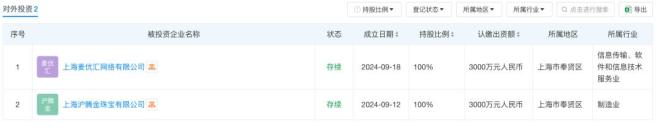 天眼查显示,麦多多隶属于2024年4月23日成立的上海麦个购网络科技有限公司,注册资本1500万元。法定代表人陈凯文在上海注册,经营范围为网上销售;服装批发;鞋帽批发零售;珠宝批发;化妆品批发;个人互联网直播服务等。其子公司有两家控股子公司,分别是上海麦优汇网络有限公司和上海沪腾金珠宝有限公司,目前三家公司都处于存续状态。