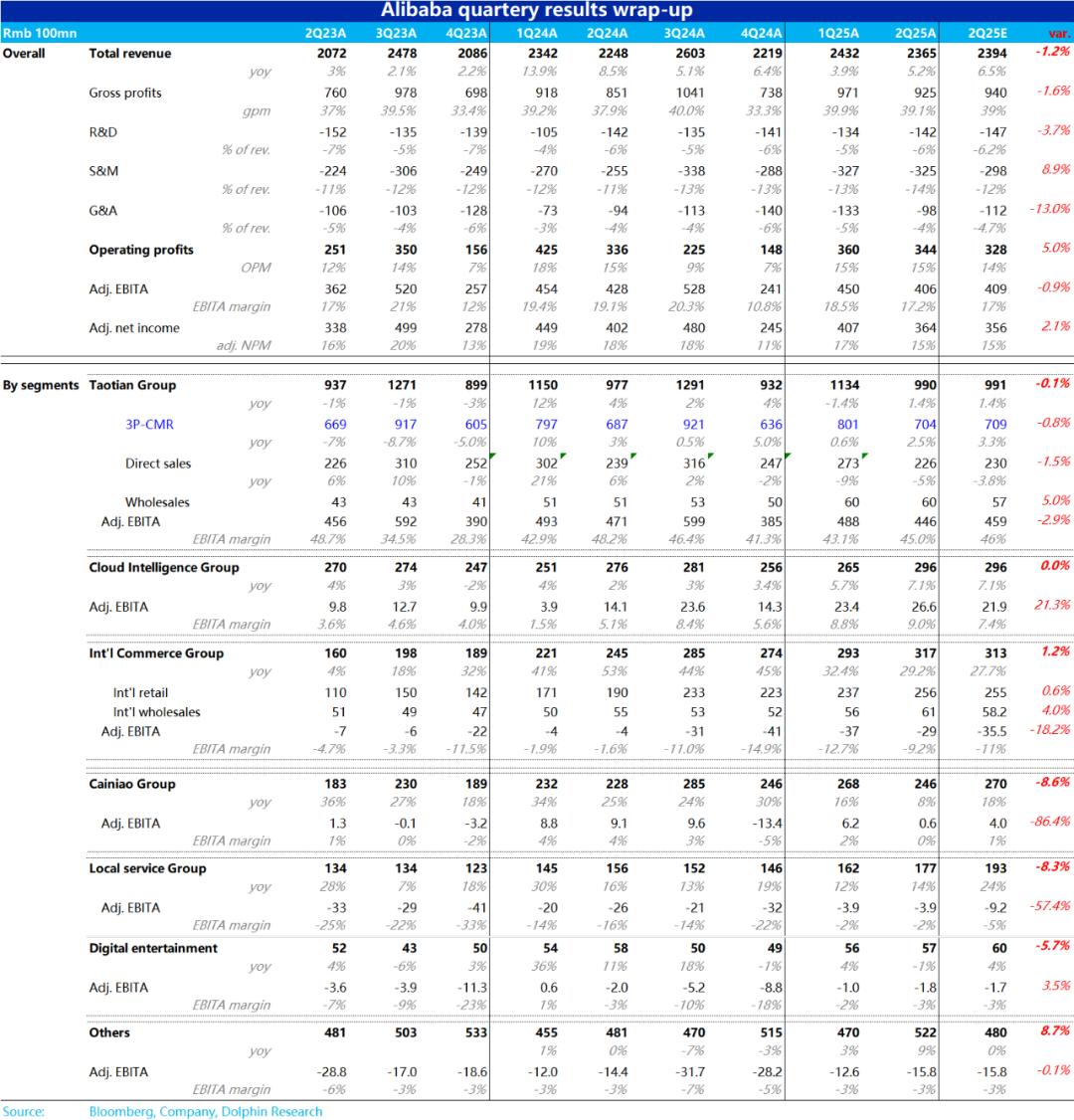 总体来看,稍不及预期 强大的批发收益对冲CMR,本季度淘天集团整体营收同比增长1.4%,基本达到市场一致预期。