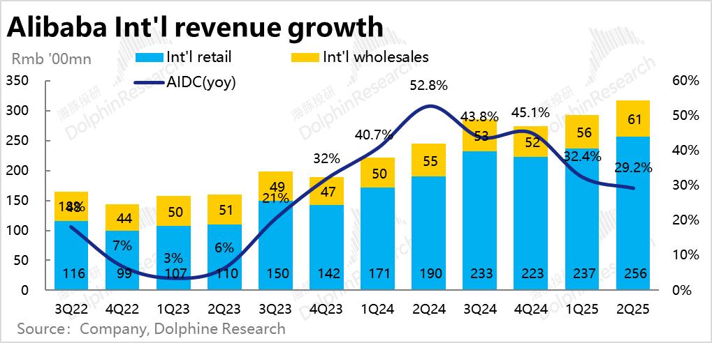 收入规模已经达到集团第二的国际电商板块,这个季度延续了之前更精细化运营的趋势。而且同期数量明显增加。虽然收入同比增长趋势略有放缓至29%,但仍高于预期增速1.5。pct。在这些业务中,国际零售和国际批发业务分别增长了35%和9.4%,与上一季相比,节奏相似,节奏相似。