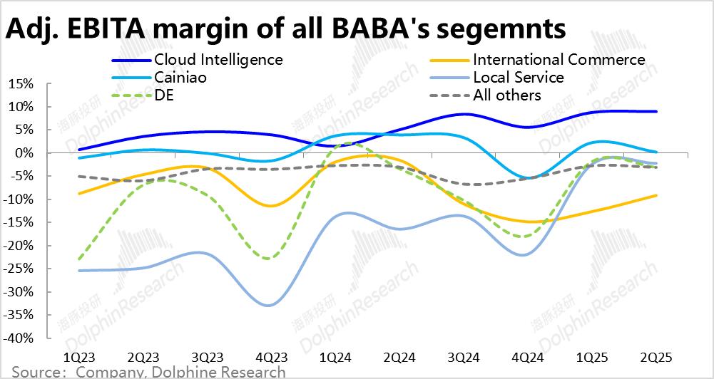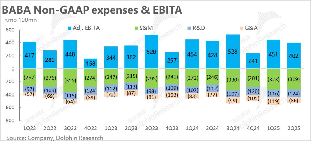 假设CMR的增长趋势有所改善,与预期相比较弱,可以勉强相互补充。利润方面,本季淘天集团adj.同比减少约5.3%的EBITA,与上个赛季相比,下跌幅度扩大了1%,实际利润也低于预期的3%。则没有任何补充的空间。与其它数据相结合,营销费用的明显增长应该是淘天利润的主要原因。