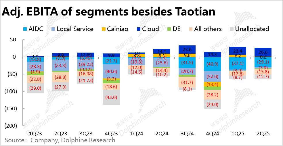 与海外业务发展高度捆绑的菜鸟,这一季伴随着国际业务的减速,菜鸟的收入同比增长率也从15.7%下降到8%。可是因为跨境物流需要大量的capex投资,上个季度已经盈利的菜鸟,这个季度的adj.EBITA大幅缩小到只有0.6亿,大幅低于预期。如果把国际电商 新手一起看,总亏损缩窄仅环比下降约2~3亿元,从合并的角度来看,减亏并不算好。。只能说重资产投入的累活都是菜鸟承担的。