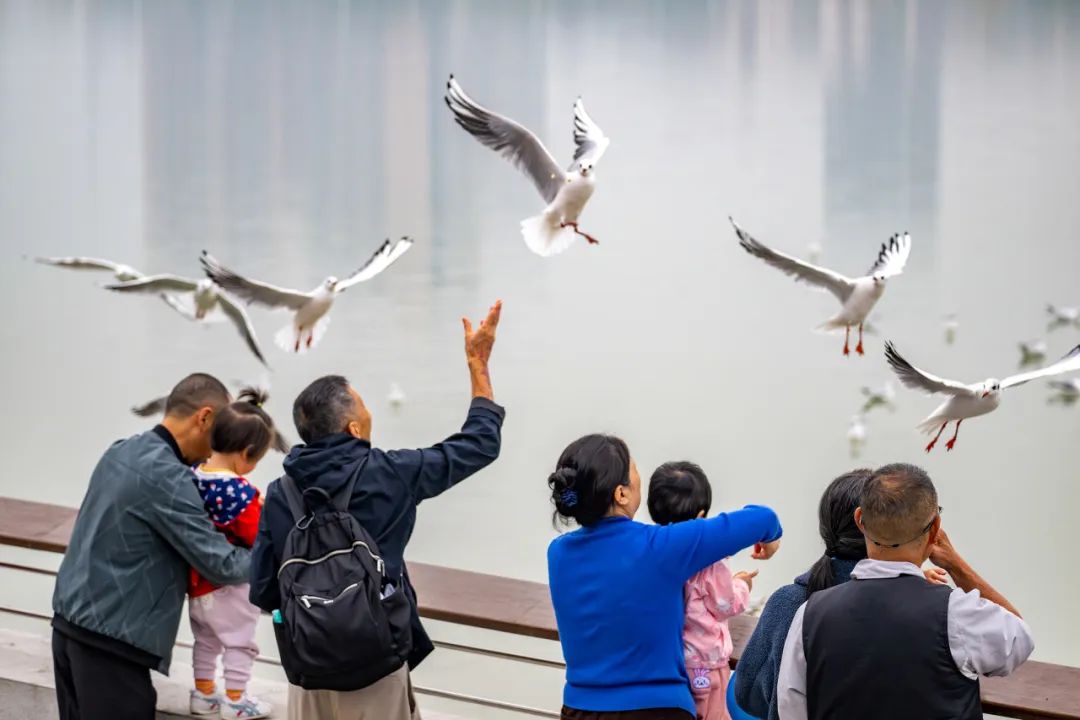 最近,随着红嘴鸥的“移动”,市民们也去了这个湖段,近距离地与红嘴鸥互动和喂食。爱鸟人士表示,由于红嘴鸥喜欢在河岸护栏和石墩上休息,产生的粪便会弄脏护栏和地面。此外,市民在喂食时会留下一些饼干和面包渣,这将加剧周围环卫工人的工作量。因此,环卫工人开始用扫帚驱逐和殴打,以防止市民喂食。
