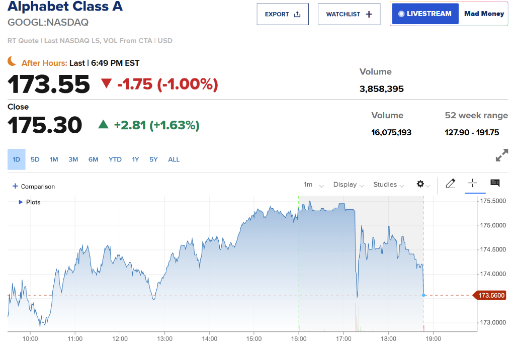 截至发稿时,谷歌A美股跌幅为173.55美元/股,此前跌幅为1.8%。