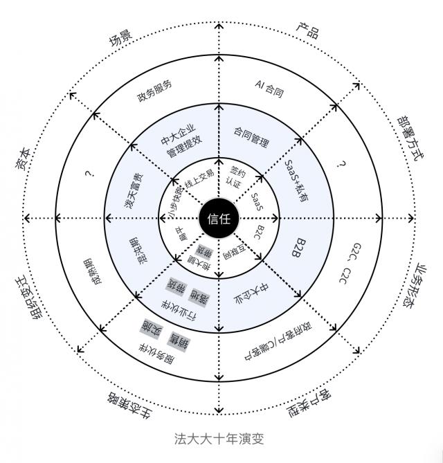 在采访黄翔之前,我在纸上画了三个同心圆,想以场景为核心,大大改变这十年的成长。然而,和他聊完之后,我发现我的想法很草率。使用三个同心圆不仅可以表达法律的巨大场景变化,还可以表达法律产品、资本、组织、生态、客户类型、业务形式、部署方式等多个方面的演变过程。,这可能更全面地看待法律的十年。