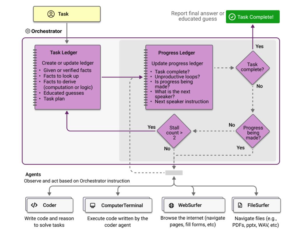 最近,基于公司Autogen框架,微软的研究团队开发了Magnetic-One系统,建立了一个复杂的Agent等级结构。专业的Agent致力于在该系统中管理Agent负责任务的全局调度。