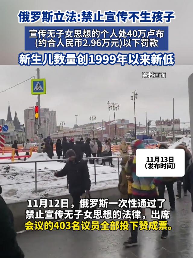 最近刷了一个视频,说俄罗斯已经立法了,禁止宣传“没有孩子的想法”。如果传播“没有孩子”的言论,最高可以罚款百万。