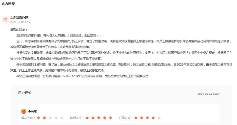 对此,12月8日,名为“山东留言处理”的ID号在这条消息下回复称,齐河县人力资源和社会保障局进行了调查处理:近日,山东莱钢永锋钢铁有限公司根据部分员工的要求制定了安置政策,该安置政策是基于尊重员工意愿,员工自愿选择与公司协商解除劳动合同并领取经济补偿,或者选择不解除劳动合同并保持运行状态。这个政策不是强制性的。