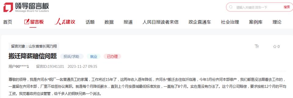 除被撤销高新技术企业资质外,2023年11月27日,齐河永锋钢厂一名员工家属在人民网“领导留言板”留言称,永锋钢厂搬到临沂临港,今年3月齐河总部停工,“我们都不能跟着去工作,一直留在齐河总部,工厂没有签订离职协议,就是每月减少工资,直到上个月按全县最低水平发放,一直拖延8个月”,但赔偿要求按前12个月平均工资计算。