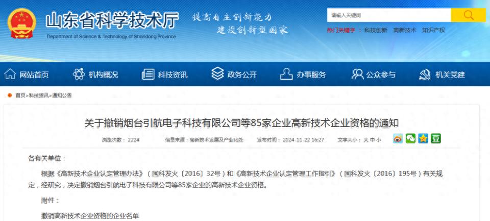 齐鲁晚报·齐鲁一点记者从山东省科技厅官网了解到,近日,山东省科技厅、山东省工业和信息化厅、山东省财政厅、国家税务总局山东省税务局联合发布《关于撤销烟台引航电子科技有限公司等85家企业高新技术企业资质的通知》(以下简称《通知》)。其中,山东莱钢永锋钢铁有限公司在列。