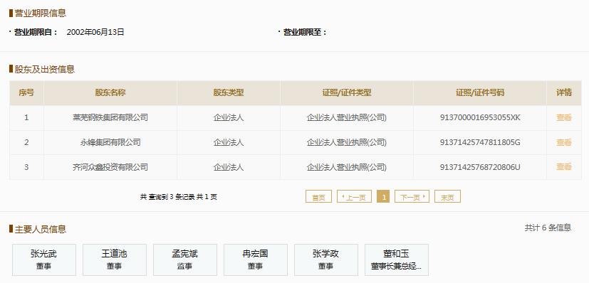 根据中国企业信用信息公示系统,山东莱钢永锋钢铁有限公司成立于2002年,注册资本3万6万元。法定代表人董和玉是莱芜钢铁集团有限公司、永锋集团有限公司和齐河中信投资有限公司的三大股东。