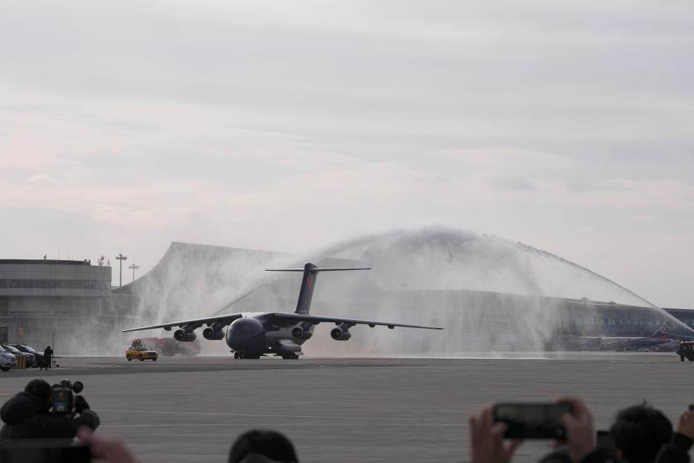 11月28日,沈阳桃仙国际机场举行了第11批韩国人民志愿军烈士遗骸迎返仪式,空军专机通过水门运输志愿军烈士遗骸。新华社记者 李钢 摄