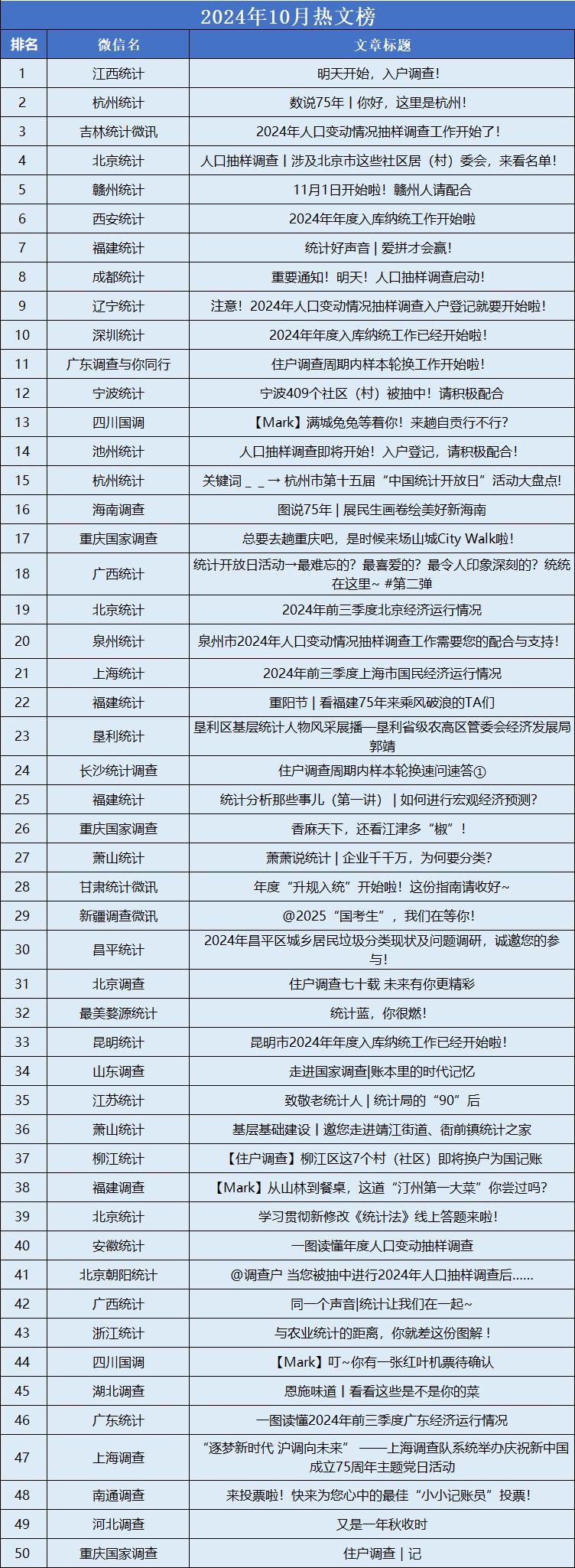 【热文榜】统计部门微信公众号热文榜(2024年10月)