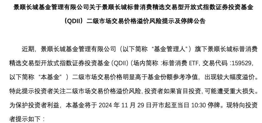 十一月二十九日,景顺长城基金宣布,其旗下景顺长城标普消费首选ETF(QDII)二级市场交易价格明显高于基金份额参考净值,溢价较大。特此提醒投资者关注二级市场交易价格溢价的风险,如果投资者盲目跟风,可能会遭受重大损失。