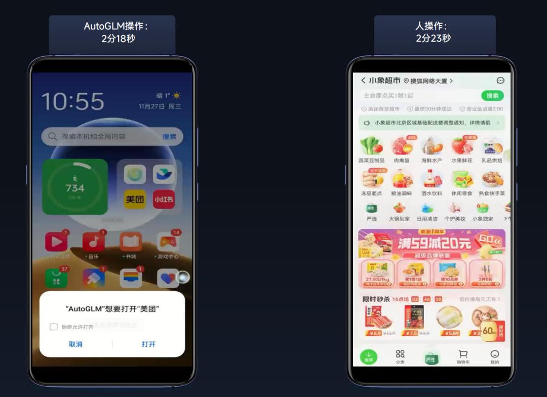 AutoGLM在另一个购买火锅食材的例子中独立执行了54步操作,并且中间没有中断。当多步、循环任务时,AutoGLM 速度表现也超过了人工操作。