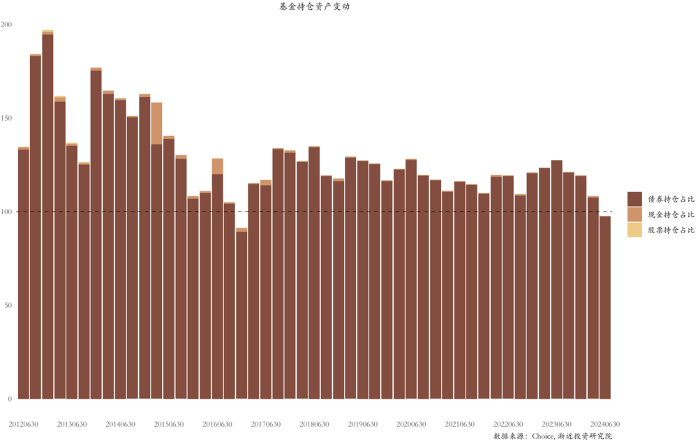 首先,我们可以通过基金总资产占净资产的比例来观察基金杠杆的应用。图中的柱形图表示,与净资产相比,基金总资产占100%以上的部分是基金加杠杆的部分。我们可以看到,2015年之前,投资产业债券的杠杆率非常高,2016年至2017年债券熊市的杠杆率基本被卸下。从那以后,杠杆率一直相对稳定。