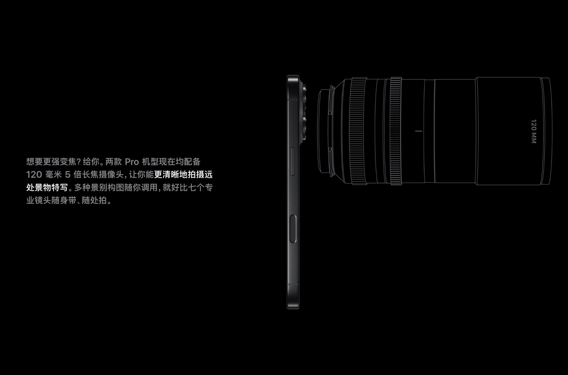 iPhone中的苹果 在11系列中,首次带来了“长焦”镜头的设计,其等效焦距为52mm,放大倍数为2。到达iPhone 13 Pro,苹果用等效焦距为72mm的长焦镜头替换了这个长焦镜头,放大倍数为3。iPhone 15 Pro 这款长焦镜头在Max上再次升级为120mm焦段镜头,放大倍数为5。