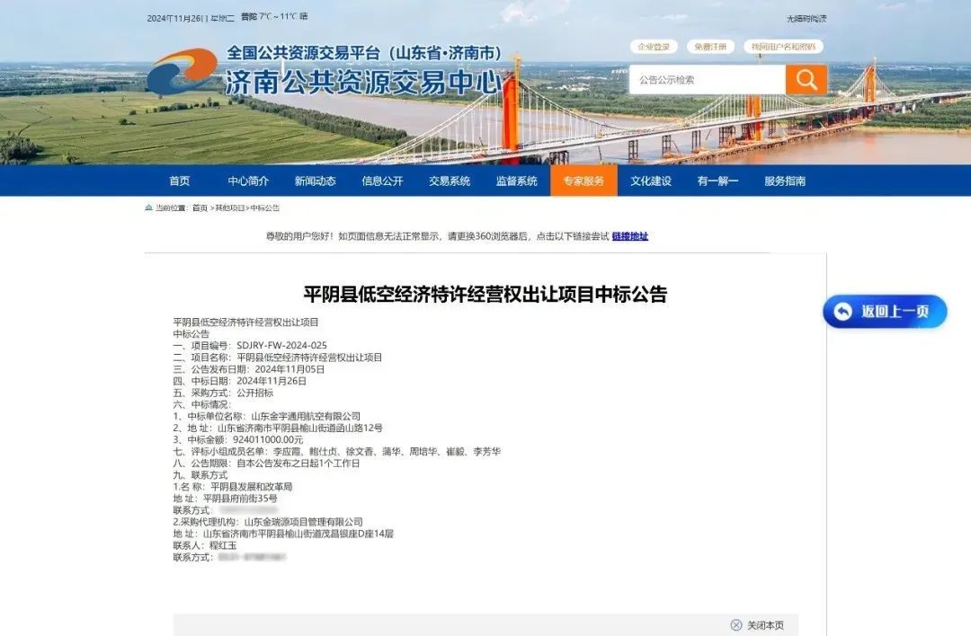 11月26日,济南公共资源交易中心官网发布《平阴县低空经济特许经营权转让项目中标公告》。数据显示,平阴县将转让低空经济30年的特许经营权,项目招标人为平阴县发展改革局,中标人为山东金宇通用航空有限公司(以下简称金宇航运),中标金额9.24亿元。
