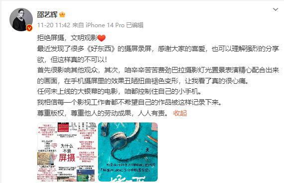 11 月 20 日本,《好东西》导演邵艺辉发博呼吁观众:拒绝屏幕摄影,文明观影。