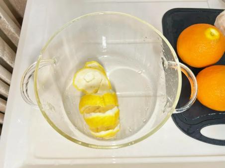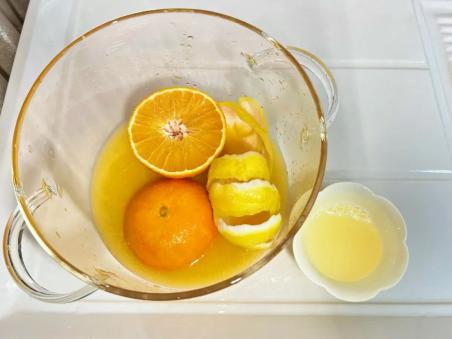 一个柠檬去皮,半个柠檬挤汁,两个橘子对半切挤汁,把它们处理好放入锅中;