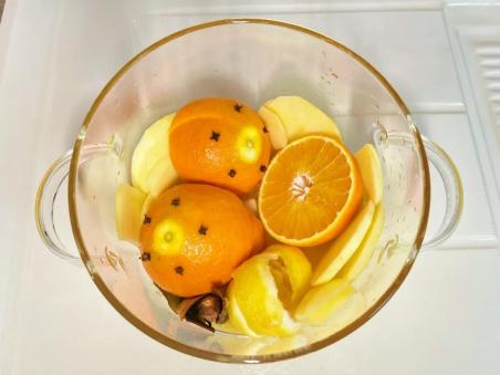 将十颗丁香放入橘皮中,加入洗净的桂皮、八角、香叶、肉豆蔻、陈皮,将苹果切片后放入;