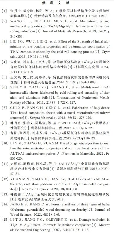 (5)Ti/Al3Ti叠层复合材料在制备Ti/Al基复合材料时,需要不断优化其制备工艺,最大限度地提高其致密性,减少孔洞、裂纹、残余应力等缺点,从而获得结构良好、组织致密、抗弹性能好的Ti/Al3Ti叠层复合材料,从而提高整体性能。