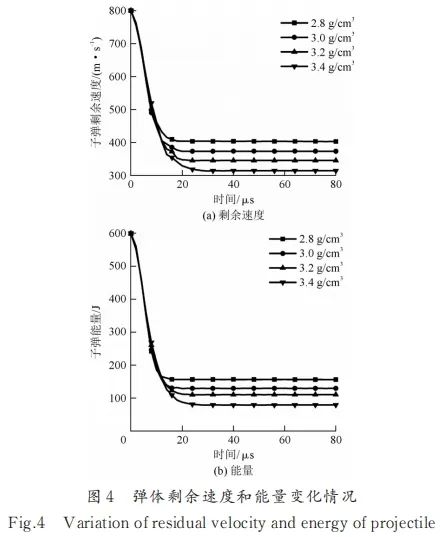 利用有限元技术模拟弹体8000 mAl3Ti层初速冲击密度分别为2.8、3.0、3.2和3.4 gTi/Al3Ti复合靶板/cm3。图4显示了弹体的剩余速度和能量变化。可以看出,当Al3Ti层的密度为2.8 g/cm3持续增加到3.4 g在/cm3时,弹体的剩余速度为403 m/s降低到314 m/s,能量从158 J降低至81 J,两者总体上呈下降趋势。所以,提高Ti/Al3Ti复合材料中的Al3Ti层密度,即在降低孔隙率的情况下,提高了其抗侵性。