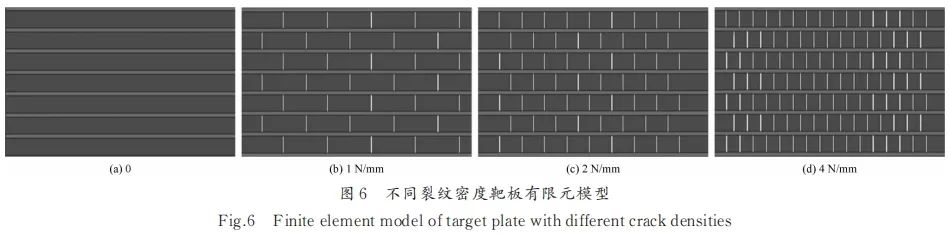 因为在子弹攻击靶板的过程中,靶板的功能范围约为弹径的10倍,为了简化整体模型,便于稳定计算攻击过程,只在这个功能范围内建立裂缝。此外,从图3b可以看出,隧道裂缝在层与层之间交错分布。因此,在模拟过程中,Al3Ti层中的间隙相互交错,并横向分布在各层之间,每层之间的纵向裂缝密度为0。、1、二、四种叠层复合材料靶板有限元模型,如图6所示。