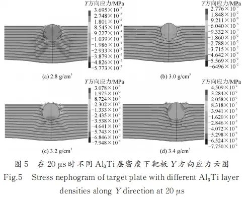 在弹体持续侵入靶板的过程中,两者之间发生了摩擦、故障、热传递等复杂的相互作用。当Al3Ti层密度增加时,靶板的整体密度也会增加,结合被侵入靶板同时Y角度的应力分布云图(如图5所示),从而增加其刚度。在弹体与靶板接触的过程中,弹体受到的压力更大,破坏程度更严重。而且靶板受损水平逐渐下降,这进一步证明了Ti/Al3Ti复合材料在孔隙率较低时具有较强的抗冲击性。