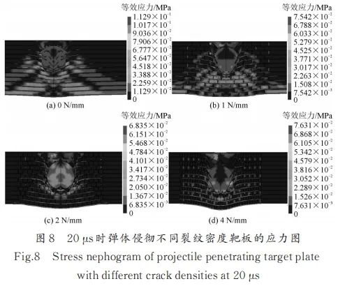 图8显示了从弹体入侵到20的进行。 μTi/Al3Ti靶板不同裂纹密度的应力场布局图。可以看出,裂缝的出现影响了当弹体侵入靶板时靶板中应力波的传播。当靶板的裂缝密度增加时,靶板内部产生的应力扩散区域逐渐减小,最终失效损坏的范围减小。另外,由于高韧性挤压,侵入无裂纹靶板的子弹头部分出现了较大程度的压缩变形,而含有裂纹的子弹失效程度较低,这进一步反映了裂纹的出现,使Ti/Al3Ti靶板的抗侵入性能显著降低。