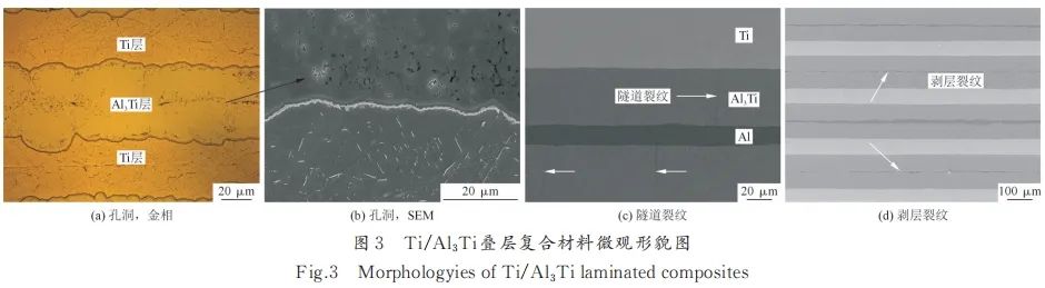 Al3Ti层中的隧道裂纹和剥层裂纹可以从图3b中观察到。隧道裂纹是由于金属间化合物Al3Ti在Ti/Al3Ti层复合材料中所承受的残留拉应力高于Al3Ti的抗拉强度,导致固层开裂和裂纹。在Al3Ti层中,剥层裂纹的形成主要与孔有关。在热处理过程中,随着Al和Ti的反应,Al3Ti层中形成的孔增加并汇聚成一排,形成一个长的裂缝,即剥层裂缝。另外,当样品在高温下冷却时,由于热残应力的作用,也会导致孔洞较多的地方开裂,最终形成剥层裂缝。