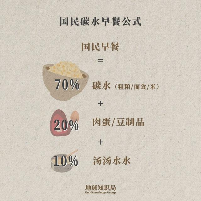 国民早餐 =70% 碳水(粗粮 / 面点 / 米) 20% 肉蛋 / 豆制品 10% 汤汤水水