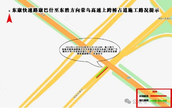 占用东康快速公路康巴什至东胜方向荣乌高速公路,跨桥下一条车道,交替进行。