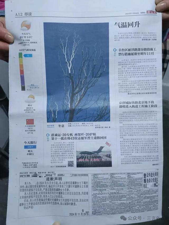在2024年11月29日的《新京报》A12版下发表了“道歉声明”。