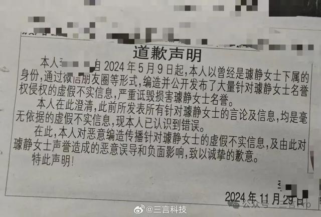 三言科技新闻 三言科技今天了解到,此前自称是“静静事件”下属的网友在报纸上发表道歉声明,称编造发布了大量关于静静的虚假虚假信息,严重诋毁损害了静静女性的声誉,现在已经意识到自己的错误。他对静静女性声誉造成的恶意误导和不良影响表示诚挚的歉意。