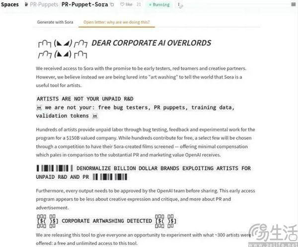 Sora PR Puppets 在相关文章中,“艺术家不是你的免费R&D人员,我们不是你的免费漏洞测试员、公关傀儡、培训数据和验证工具”,“每一件作品都需要在分享之前经过。 OpenAI 团队批准。这个早期的浏览计划似乎与其说是关于创意表达和评论,不如说是关于公关和广告。"