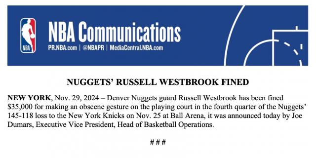 北京时间 11 月 30 日,NBA 由执行副总裁和篮球运营主管乔的官方公告发布 - 杜马斯宣布罚单,掘金球员威少在掘金。 在比赛中,VS尼克斯在赛场上做出了粗俗的手势,被联盟处以 35000 美金罚款。