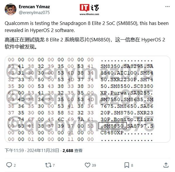 IT 世家 11 月 30 每日消息,消息来源 Erencan Y ı lmaz 于 11 月 28 日在 X 通过深挖澎湃,平台发表文章 HyperOS 2 系统,第二代高通骁龙在代码中被发现 8 至尊版的痕迹。
