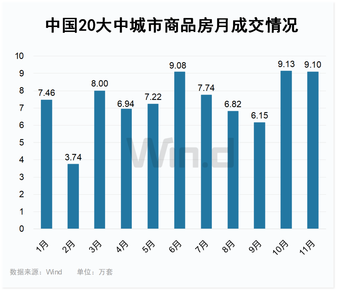 十月和十一月房市交易在各地政策的支持下火爆。Wind数据显示,10月份中国20个大中城市新房销售额超过9.1万套,创下年内新高,比9月份6.15万套大幅上升48.38%。另外,11月份还没有结束,目前20大中城市的成交量已达9.1万件,预计11月份的总成交量将超过10月份再创新高。可以看出,在各地楼市政策的使力下,新房市场的交易已经持续火爆。