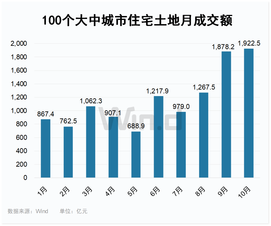 随着楼市交易的复苏,土地交易也变得活跃起来。Wind数据显示,从8月份开始,中国100个大中城市的住宅用地交易持续复苏,均超过1000亿元,不断创下年内新高。住宅用地交易的改善意味着房地产企业的征地意愿明显增加,土地拍卖火爆。开发商看好房地产的未来是一个重要原因。