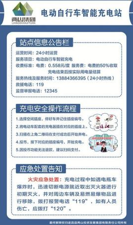 新建的电动自行车充电站严格实行充电费用价格分离和明码标价制度,即充电费用由电费和服务费组成,其中电费按国家规定的电价标准收取,服务费按电费的50%收取,主要用于填补充电设施建设的运营成本。