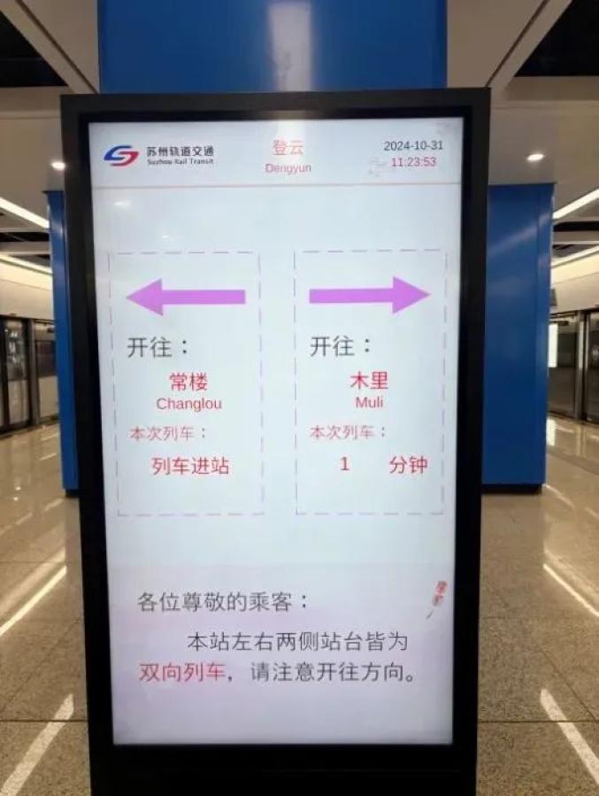 登云站的乘客请注意。本网站采用单向双向运行模式,两侧平台均有列车前往常建筑和木里。乘车前,注意确认列车的方向。车站将采用平台导航和平台门上方的PIS屏幕(见下图)。、站内广播、工作人员指导等方式提醒,乘车时请及时注意。