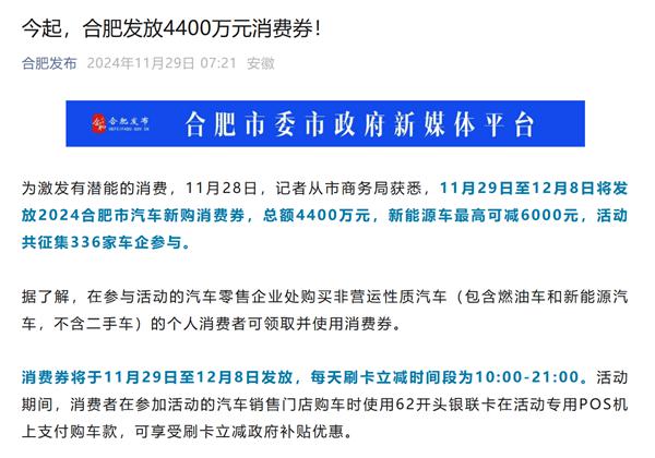 11 月 29 日本,合肥发表文章称,11 月 29 日至 12 月 8 日将发放 2024 购买合肥汽车优惠券,总金额 4400 万元,新能源汽车最多可减少。 6000 元,活动共征选 336 参与家车企业。