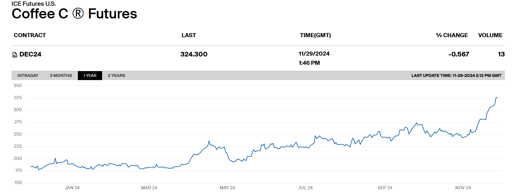 截至发稿时,11月29日,美国C型咖啡期货价格略有回调,下跌约0.567%。