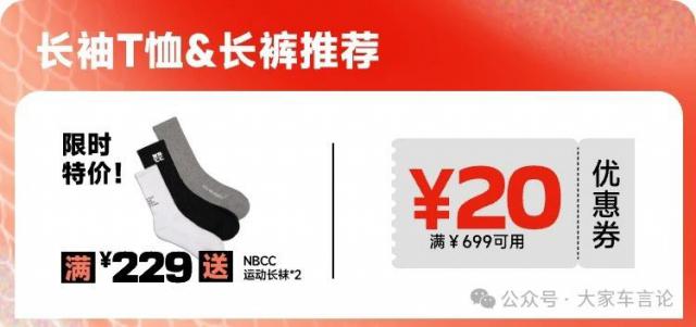 长袖 T 恤 & 买满了裤子系列 ¥ 229 即送出 NBCC 长袜 2 双,同样有「满 ¥ 699 减 ¥ 20」优惠券可以叠加使用。